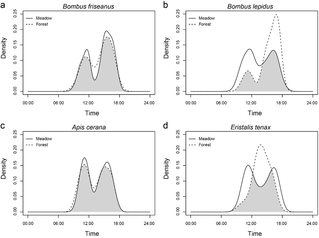 图4 草甸与森林中主要传粉昆虫日活动模式的比较。(a)Bombus friseanus,(b)Bombus lepidus,(c)Apis cerana,(d)Eristalis tenax在草甸与森林中的日活动模式对比