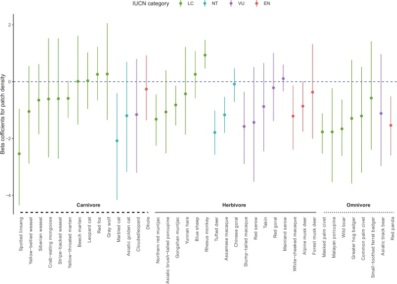 图2 斑块密度对单物种占域率的平均效应,物种首先按照食性排序,然后按照 IUCN 红色名录级别 (LC、NT、VU、EN) 进行排序,最终以每个类别内的平均效应大小排序。点代表平均效应大小,竖线表示 95% 的贝叶斯置信区间。点和线的颜色对应 IUCN 红色名单类别:LC(无危)、NT(近危)、VU(易危) 和 EN(濒危)。