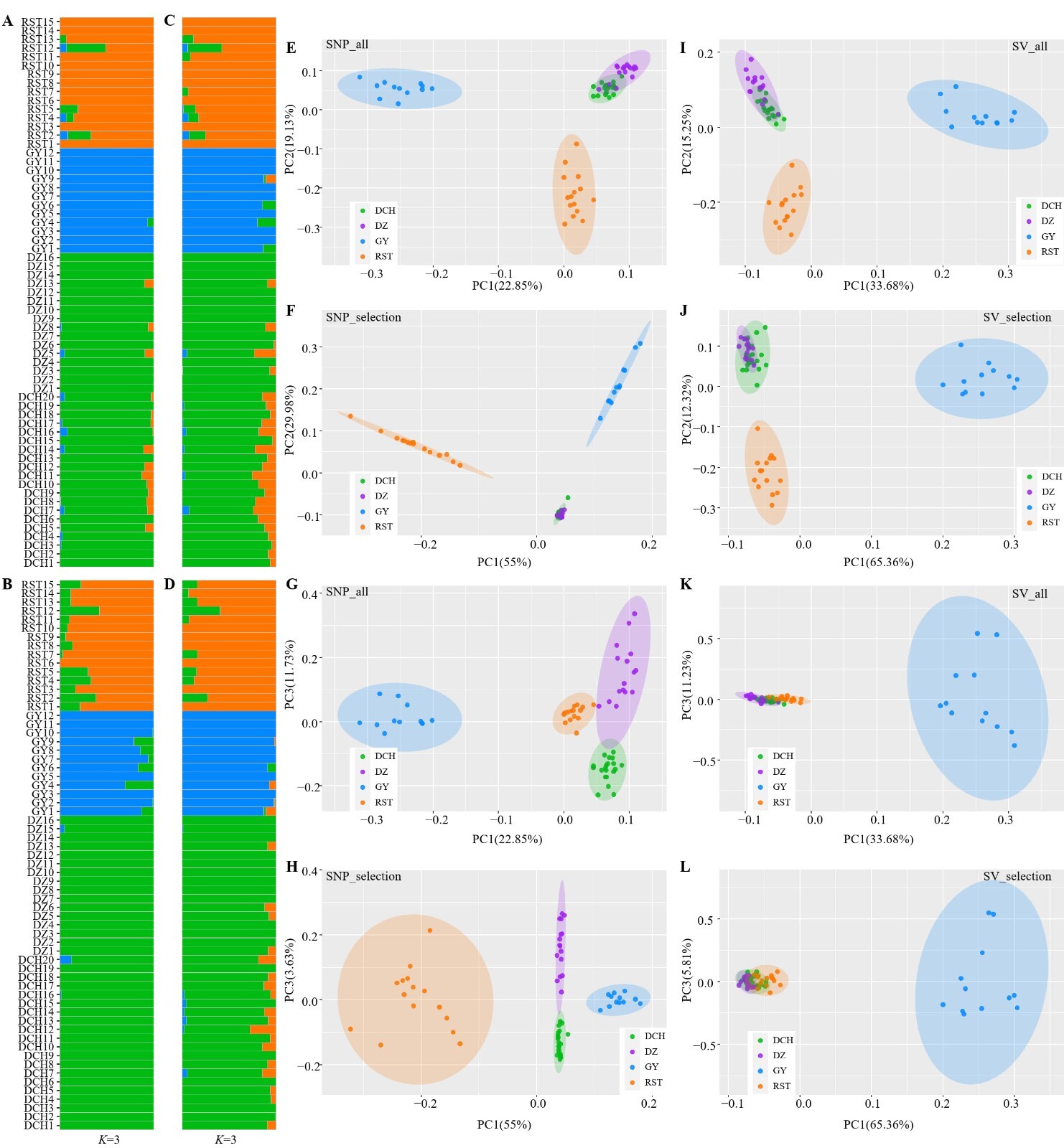 研究结果显示,基于SVs和SNPs所得的种群遗传分化系数(FST)、种群遗传结构、以及受选择性位点附近的基因功能富集结果存在明显差异。当基于SVs时,FST更大、个体间的遗传混合更多,受选择SVs相关基因富集于对非生物刺激的响应和缺水胁迫响应,而受选择SNPs相关基因则富集于脂质代谢过程。表明在保护基因组学研究中,尤其对于朱红大杜鹃等狭域分布的极小种群野生植物,仅靠传统SNPs分析可能会漏掉遗传结构与适应性信息。因此,研究建议在未来保护基因组学研究中,同时分析SNPs与SVs,以获取更全面的遗传背景,为科学保护提供更多依据。