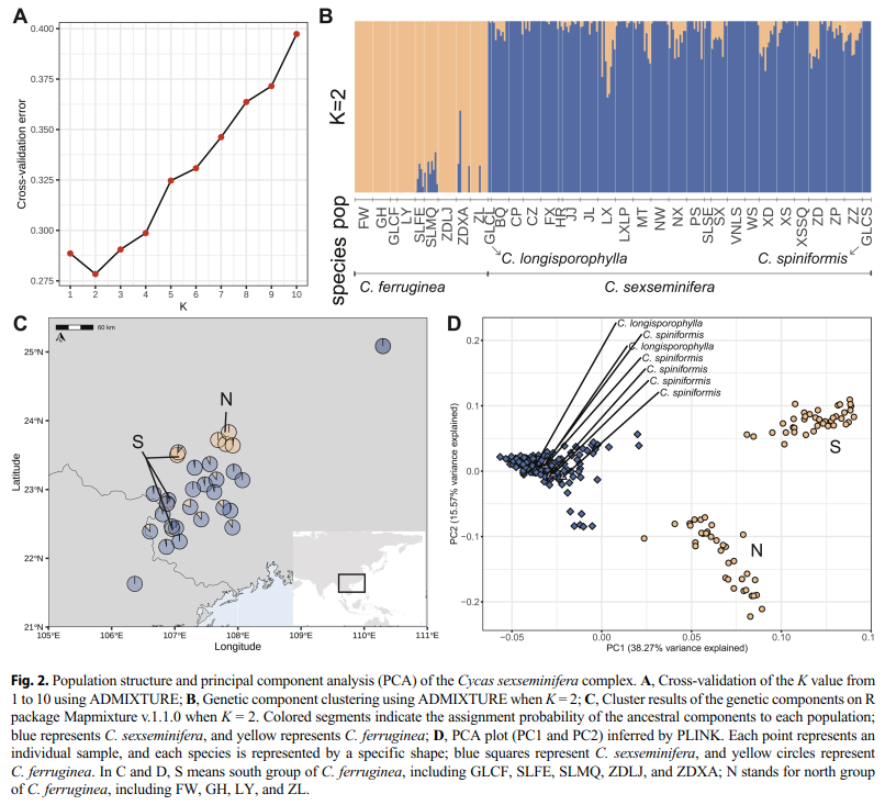 中国科学院昆明植物研究所龚洵研究组长期致力于苏铁属植物多样性、演化、濒危机制和保护的研究。先后采用分子和形态相结合的方法对滇南苏铁(C. diannanensis)复合群、叉孢苏铁(C. segmentifida)复合群和台湾苏铁(C. taiwaniana)复合群的物种做了界定。最近,又在TAXON上发表了六籽苏铁(C. sexseminifera)复合群的研究结果。基于整合物种概念(ISC),采集了该复合群4个物种的简化基因组(RAD-seq)和形态数据等进行分析,并采用系统发育基因组学推断、BPP分析、主成分分析等多种分子物种界定方法,澄清了该复合群的物种,解决了以下核心问题: