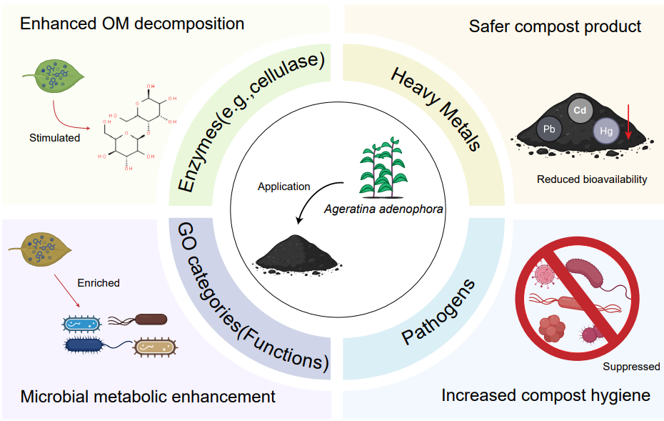 中国科学院昆明植物研究所大型真菌种质资源与绿色发展专题组持续开展农林废弃物资源化利用底层关键技术和科学问题研究,系统解析了生物质转化过程中微生物互作、毒性消减与养分调控的核心规律,在堆肥发酵、清洁转化、高值利用等方面已形成较好技术积累。紫茎泽兰(Ageratina adenophora)是我国首批公布的重点管理外来入侵物种,素有“生态杀手”之称,其释放的有毒倍半萜类物质严重破坏本土生态、阻碍农牧生产,有研究提到紫茎泽兰对畜牧业和草地生态系统的综合损失约36.2亿元人民币/年,传统处置方式易造成二次污染且难以资源化利用。团队立足既有研究基础,围绕紫茎泽兰无害化处置与高值化利用取得系列进展,构建“堆肥预脱毒—黑水虻深度转化”双相生物转化体系,通过二次脱毒、多重提质,成功将其转化为优质生物肥,为入侵植物综合治理与循环利用提供新可能。