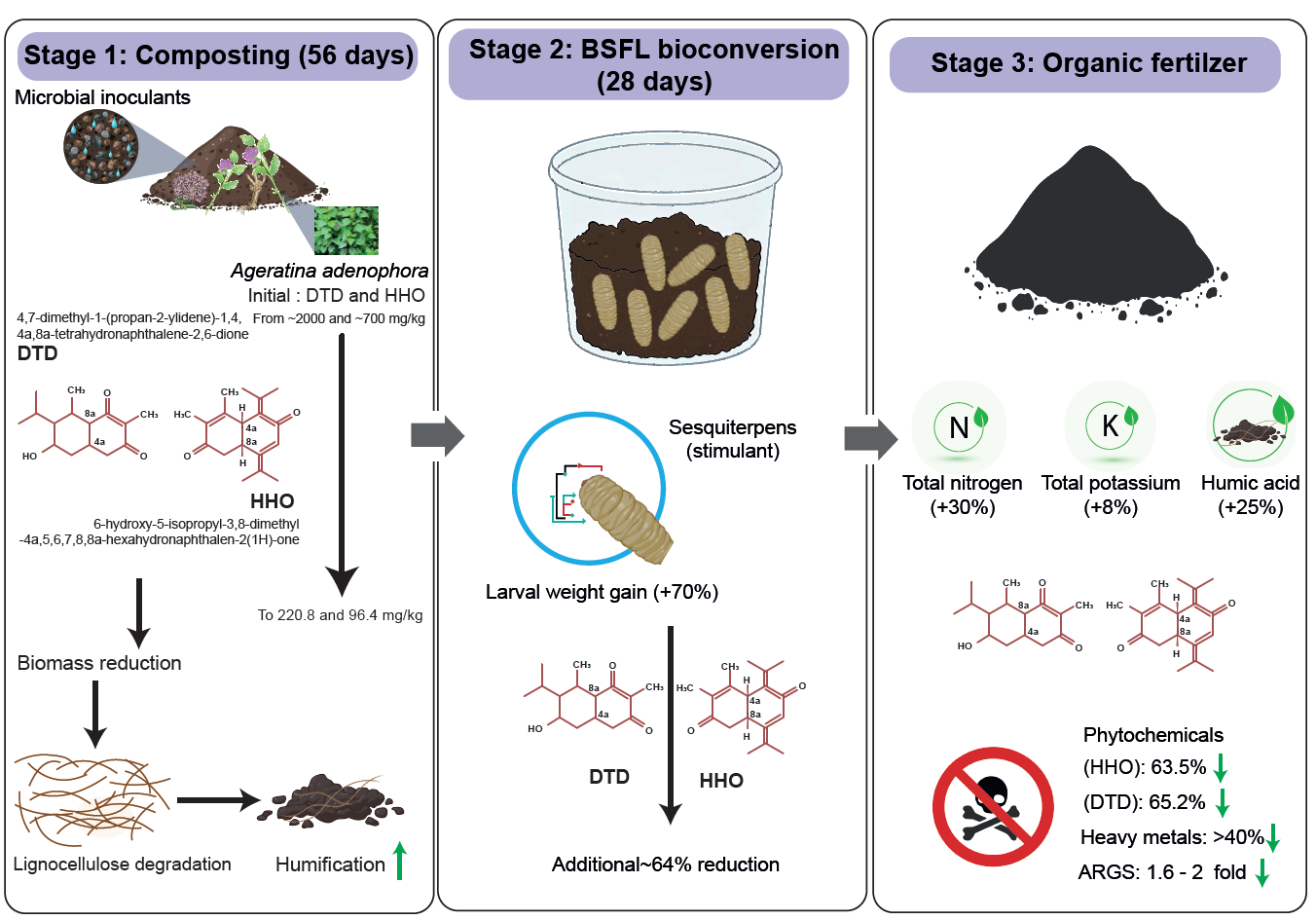 在堆肥预脱毒基础上,团队创新引入黑水虻幼虫(BSFL)开展28天深度生物转化,形成两段式协同转化闭环。结果显示,黑水虻可对残留毒性物质实现二次高效降解:DTD、HHO 分别再降 65.2%、63.5%,总脱毒率超 96%;更意外的是,低浓度残留毒性物质未抑制幼虫生长,反而通过激活代谢通路使幼虫增重提升70%,呈现典型毒物兴奋效应。转化过程中,黑水虻通过肠道微生物代谢、物理掘穴增氧、酶促腐殖化三重作用,实现多重提质:1)重金属钝化:可提取态重金属降幅超 40%,Cd、Pb 分别降低 67%、54%,达标农用安全限值;2)养分富集:总氮提升 30%、总钾提升 8%,有机质稳定化程度显著提高(图 3);3)环境友好:温室气体(CH4、N2O、NH3)与恶臭 VOCs 排放大幅降低,契合低碳循环要求。