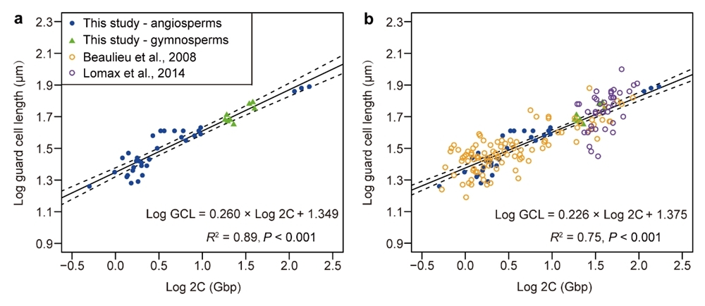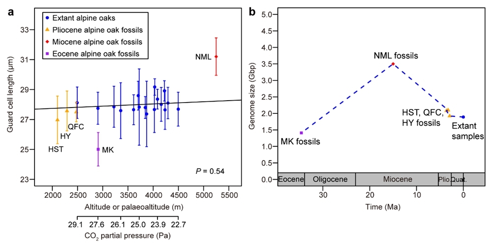 中国科学院西双版纳热带植物园(简称版纳植物园)古生态研究组和生物地理与生态学研究组团队通过对西藏芒康(晚始新世,~34.6 Ma南木林(中中新世,~15 Ma)以及云南浑水塘、庆福村、鹤庆红园(晚上新世,3.6–2.58 Ma5个植物群(图1)中采集的壳斗科栎属高山栎组(Quercussect.Heterobalanus)化石角质层进行分析,发现西藏南木林高山栎化石气孔尺寸显著大于其它地区的化石及其最近现生亲缘种的气孔(图2a由于植物气孔大小与基因组大小呈显著正相关,叶化石的气孔大小可作为估测古基因组大小的有效替代指标。该研究基于42种种子植物和已发表的139种被子植物的气孔大小与基因组大小,完善了二者之间的正相关关系曲线(图3),进而利用上述5个植物群的高山栎组化石气孔大小估算其古基因组大小。结果显示,西藏南木林化石的基因组大小远高于西藏芒康和云南上新世3个植物群的化石以及现生高山栎组植物(二倍体)的基因组大小(图2b),其比值落在四倍体与二倍体基因组大小比率的范围内。据此推测,高山栎组植物在始新世时期为二倍体,在中新世时期可能发生了古多倍化事件成为四倍体,然而该四倍体很可能随后灭绝,导致从晚上新世至今只存在二倍体。