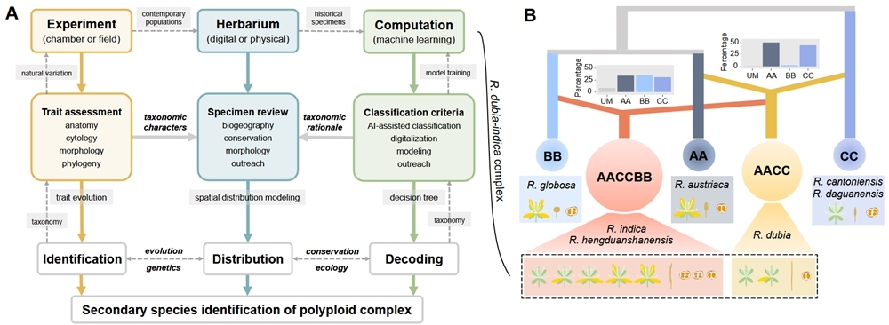植物界中杂交与多倍化频发,使得许多类群的物种界限模糊,传统依赖形态的鉴定方法面临挑战。针对这一困扰植物分类学和生物多样性研究的问题,中国科学院西双版纳热带植物园(以下简称“版纳植物园”)星耀武团队提出一套用于分类复杂类群物种鉴定的研究框架。团队以东亚广布的多倍体复合体Rorippa dubia–indica为研究对象,构建整合性状演化、标本复核与机器学习的“三位一体”研究体系,从物种鉴定、分布重建与分类解码三个层面,对分类复杂类群开展系统性的二次评估。