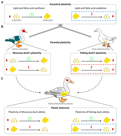 中国科学院昆明动物研究所张亚平院士团队联合海南省农业科学院畜牧兽医研究所、中国热带农业科学院热带作物品种资源研究所等团队,运用多组学分析和细胞功能实验,揭示了亲本番鸭和北京鸭之间肥肝表型可塑性的差异主要源于脂质代谢及脂肪酸氧化能力的不同(https://doi.org/10.1016/j.ygeno.2022.110518)。在此基础上,研究团队围绕“番鸭-北京鸭-骡鸭”杂交体系,对普通饲养和填喂饲养状态下的肝脏转录组数据进行了详细分析,发现亲本基因表达的可塑性在杂交子代发生重塑。在过度填喂条件下,北京鸭与番鸭的共同祖先表现出脂肪酸合成通路上调、脂肪酸氧化通路下调的表型可塑性;物种分化后,番鸭保留了这一祖先型可塑性,而北京鸭在很大程度上丧失了脂肪酸氧化通路下调的能力,从而限制了形成肥肝的潜力;在骡鸭中,来源于番鸭的等位基因维持了祖先型可塑性,而来源于北京鸭的等位基因则恢复了其在亲本中已丧失的可塑性,二者共同作用,最终促进了骡鸭肥肝杂种优势的形成(图2)。该研究通过进化生物学和家禽学的学科交叉,系统解析了亲本表型可塑性的演化轨迹如何影响杂交子代表型优势的形成,从基因转录可塑性视角提出了一种新的杂种优势形成机制,为理解复杂性状的遗传基础提供了新的思路。