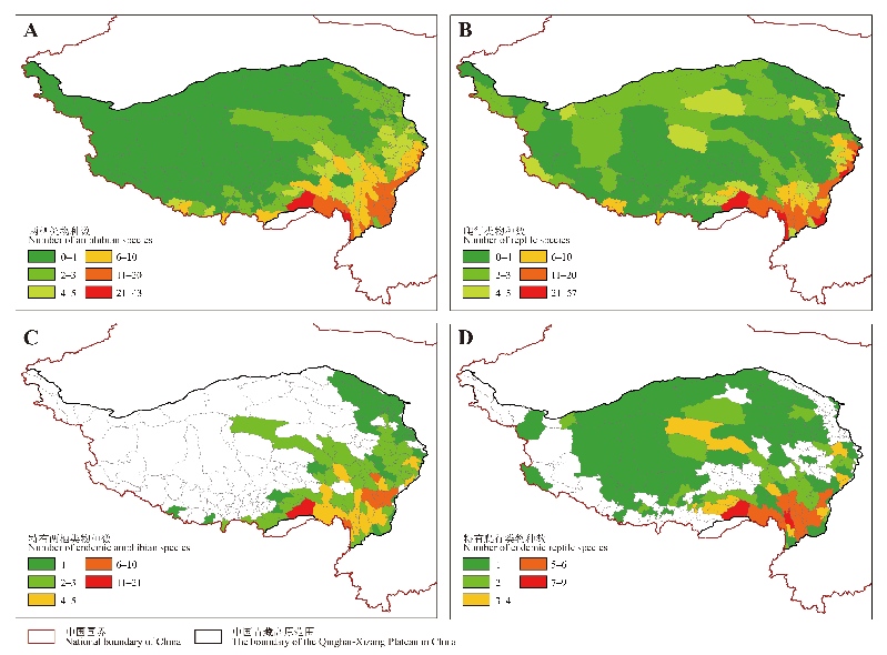 图3 中国青藏高原两栖、爬行动物多样性及特有性分布格局。A:两栖动物;B:爬行动物;C:特有两栖动物;D:特有爬行动物。引自卢宸祺等(2025)。